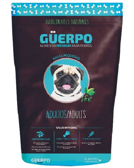 «Güerpo Adulto, razas pequeñas. Alimento premium para perros. Ingredientes naturales. Aceites esenciales, carne pura de pollo.»